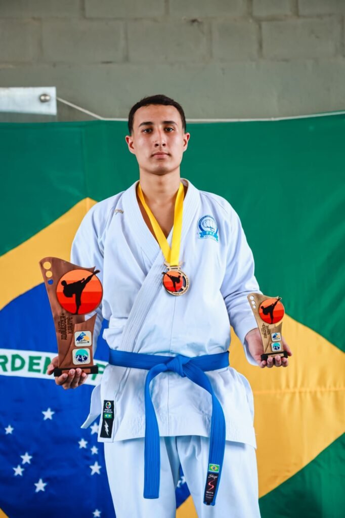 Leiner, de 18 anos, faixa marrom e federado pela Federação de Karatê Fluminense (FKF), conquistou medalha de ouro na categoria +16 e o troféu de ouro na categoria Open, tornando-se tricampeão em Kumitê.